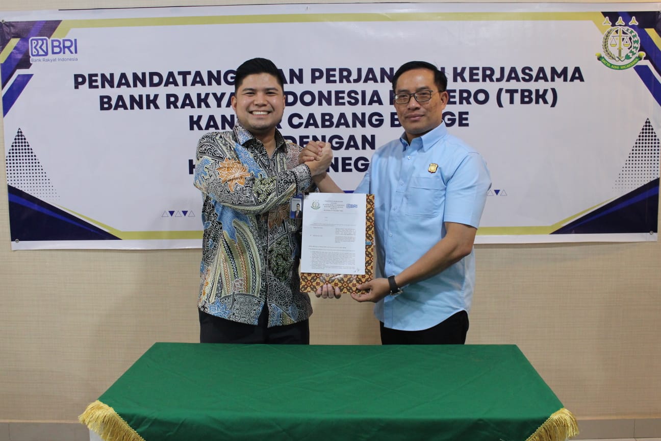 Perbankan PT Bank Rakyat Indonesia(BRI)Cabang Balige resmi menandatangani Perjanjian Kerjasama atau Memorandum of Understanding(MoU)dengan Kejaksaan Negeri(Kejari) Toba di aula utama Kejari Toba(Jumat,17/4/2026). Head Office BRI BO Balige, Namal Kautsar tampil mengenakan batik corak lengan panjang dan Kepala Kejaksaan Negeri Toba Muslih tampil dengan kemeja biru lengan pendek dalam proses penandatangan MoU tersebut.
