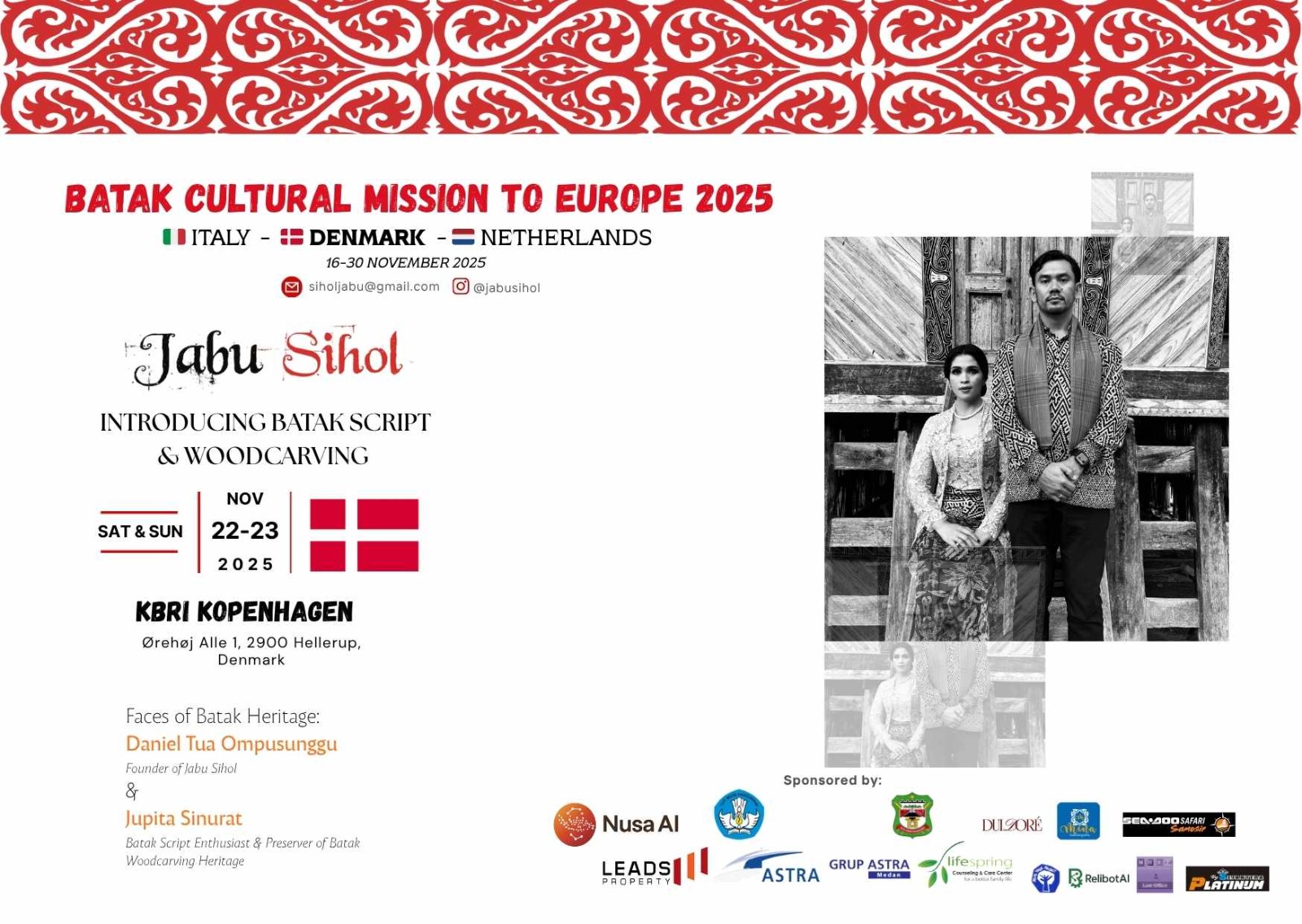 Jabu Sihol Bawa Misi Budaya Batak ke Eropa 2025 — Sebuah perjalanan yang sarat makna dan emosi tengah disiapkan oleh komunitas budaya Jabu Sihol. Tahun 2025, langkah kaki mereka akan menjejak tanah Eropa, membawa harum warisan leluhur Batak ke tiga negara: Italia, Denmark, dan Belanda. Dalam rentang waktu 16 hingga 30 November 2025, misi ini akan menjadi panggung bagi Aksara Batak dan Ukiran Batak untuk berbicara kepada dunia.