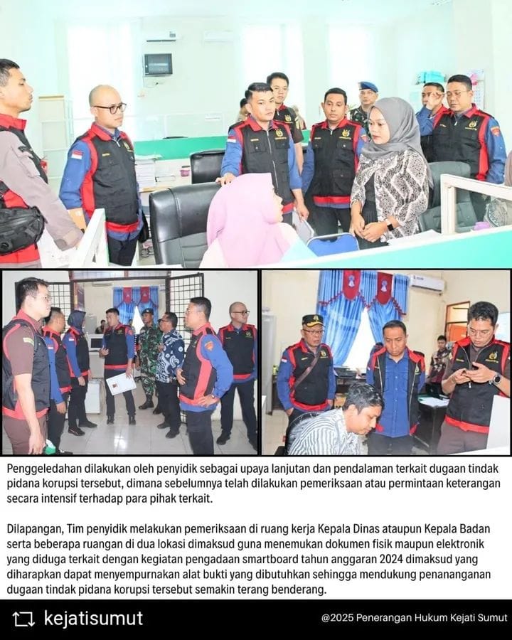 Penyidik Tindak Pidana Khusus (Pidsus) Kejaksaan Tinggi Sumatera Utara (Kejatisu) melakukan penggeledahan di dua lokasi di Kota Tebingtinggi, Kamis (30/10/2025). Langkah itu dilakukan untuk mengungkap dugaan tindak pidana korupsi dalam proyek pengadaan papan tulis interaktif atau smart board bagi seluruh Sekolah Menengah Pertama (SMP) Negeri di kota tersebut pada Tahun Anggaran 2024.