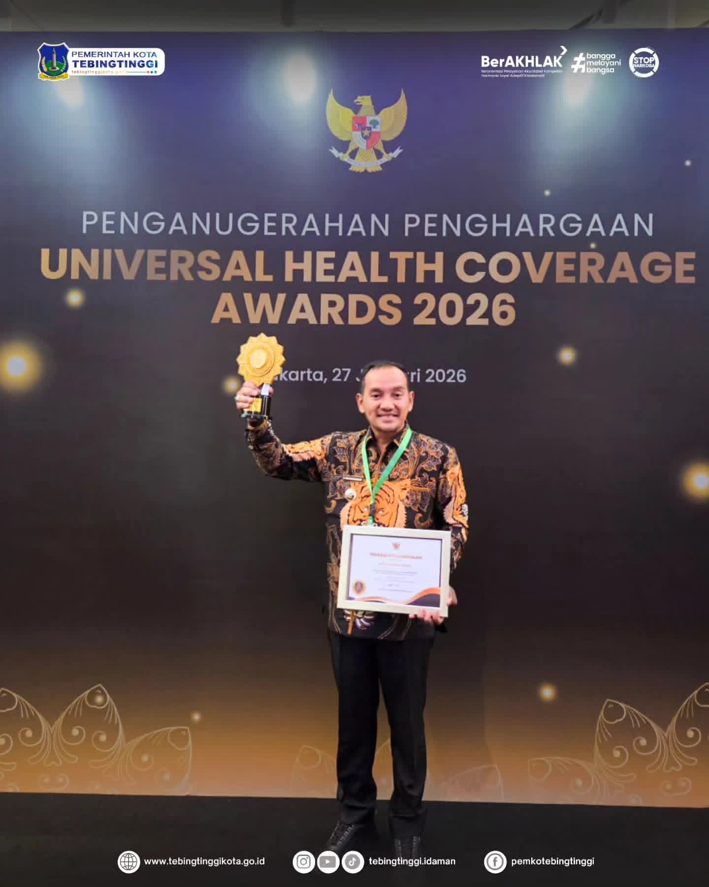 Penghargaan prestisius ini diserahkan langsung oleh Menteri Koordinator Bidang Pemberdayaan Masyarakat RI, A. Muhaimin Iskandar, kepada Wali Kota Tebingtinggi, H. Iman Irdian Saragih, dalam acara UHC Award 2026 yang berlangsung di Jakarta International Expo (JIEXPO) Kemayoran,pada hari Selasa (27/01/2026).