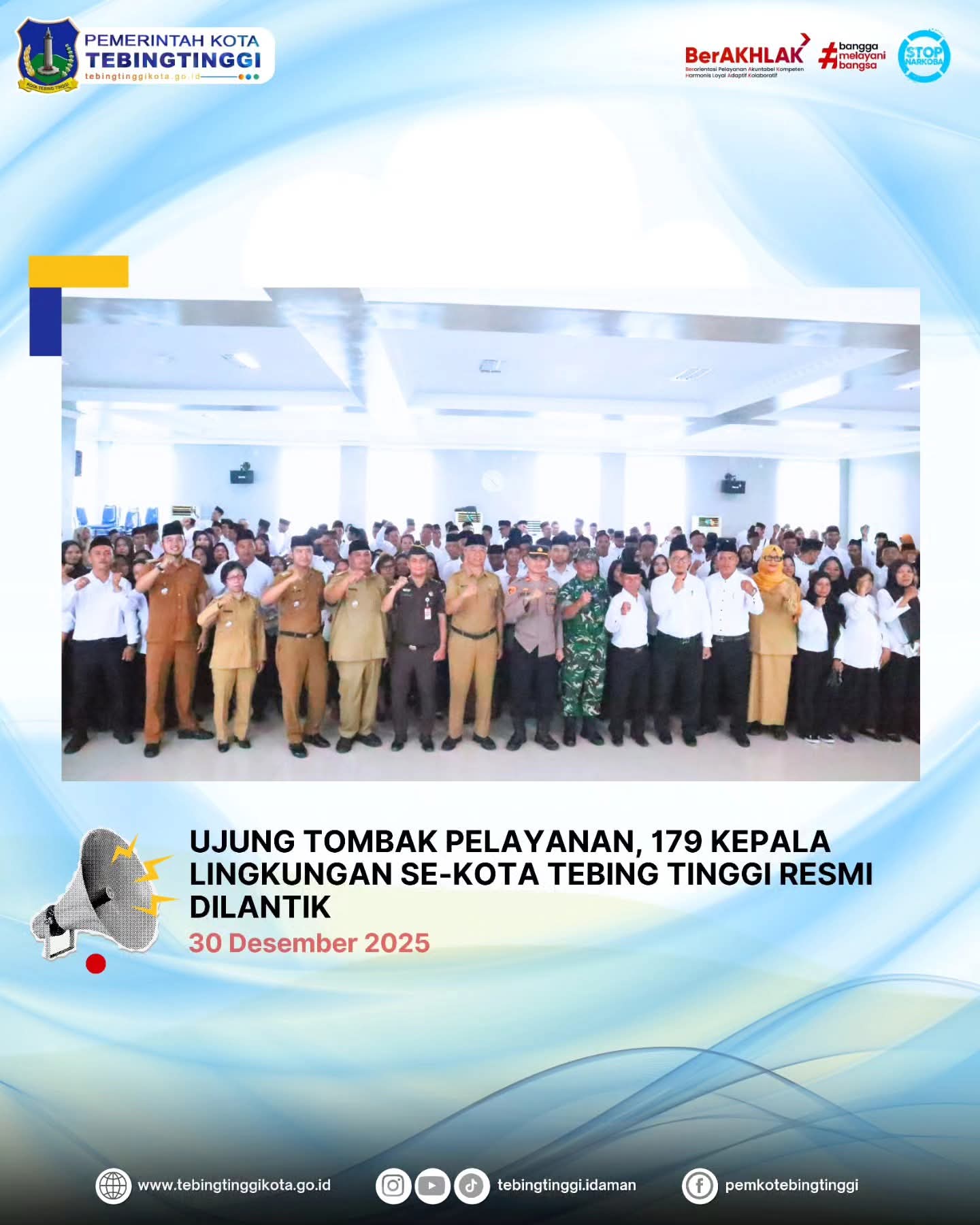 Pemerintah Kota (Pemko) Tebingtinggi resmi melantik 179 orang Kepala Lingkungan (Kepling) masa bakti 2025–2028, Selasa (30/12/2025) di Aula Lantai IV Gedung Balai Kota, Jalan Dr. Sutomo, Selasa (30/12/2025).