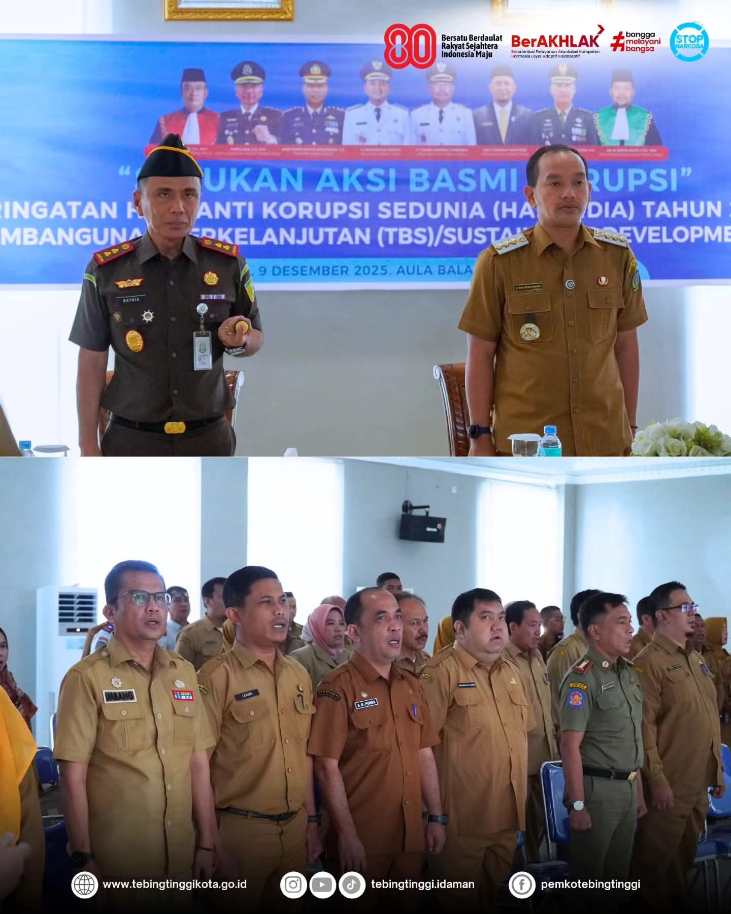 Pemerintah Kota Tebingtinggi menggelar peringatan Hari Anti Korupsi Sedunia (Hakordia) Tahun 2025 yang dirangkai dengan Rapat Koordinasi Tujuan Pembangunan Berkelanjutan (TPB)/Sustainable Development Goals (SDGs),pada hari Selasa (09/12/2025) di Aula Lantai IV Gedung Balai Kota Tebingtinggi.