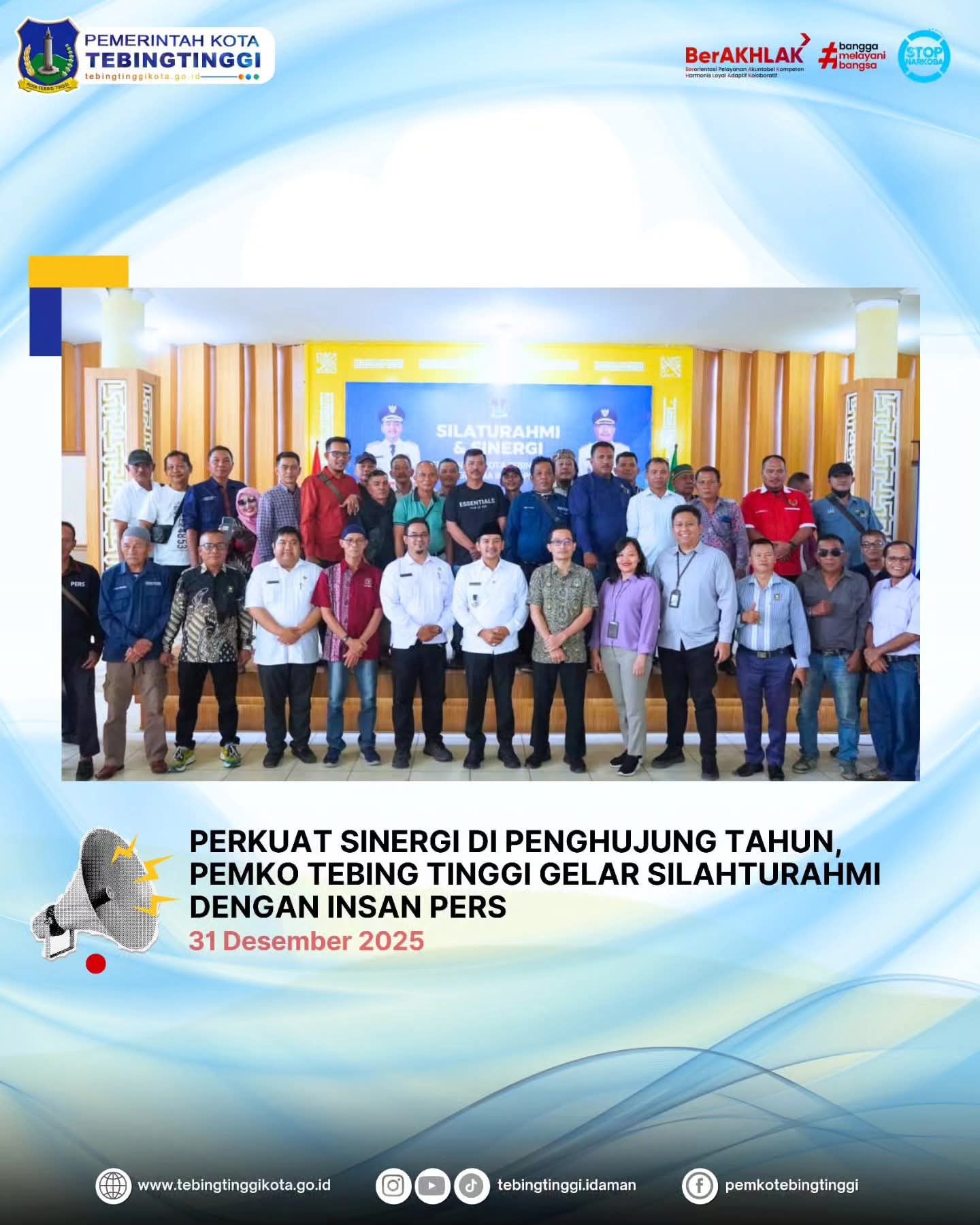 Menutup kalender kegiatan tahun 2025, Pemerintah Kota (Pemko) Tebingtinggi melalui Dinas Komunikasi dan Informatika (Kominfo) menggelar acara Silaturahmi dan Sinergi bersama Insan Pers di Gedung Hj. Sawiyah, Jalan Dr. Sutomo,pada hari Rabu (31/12/2024).