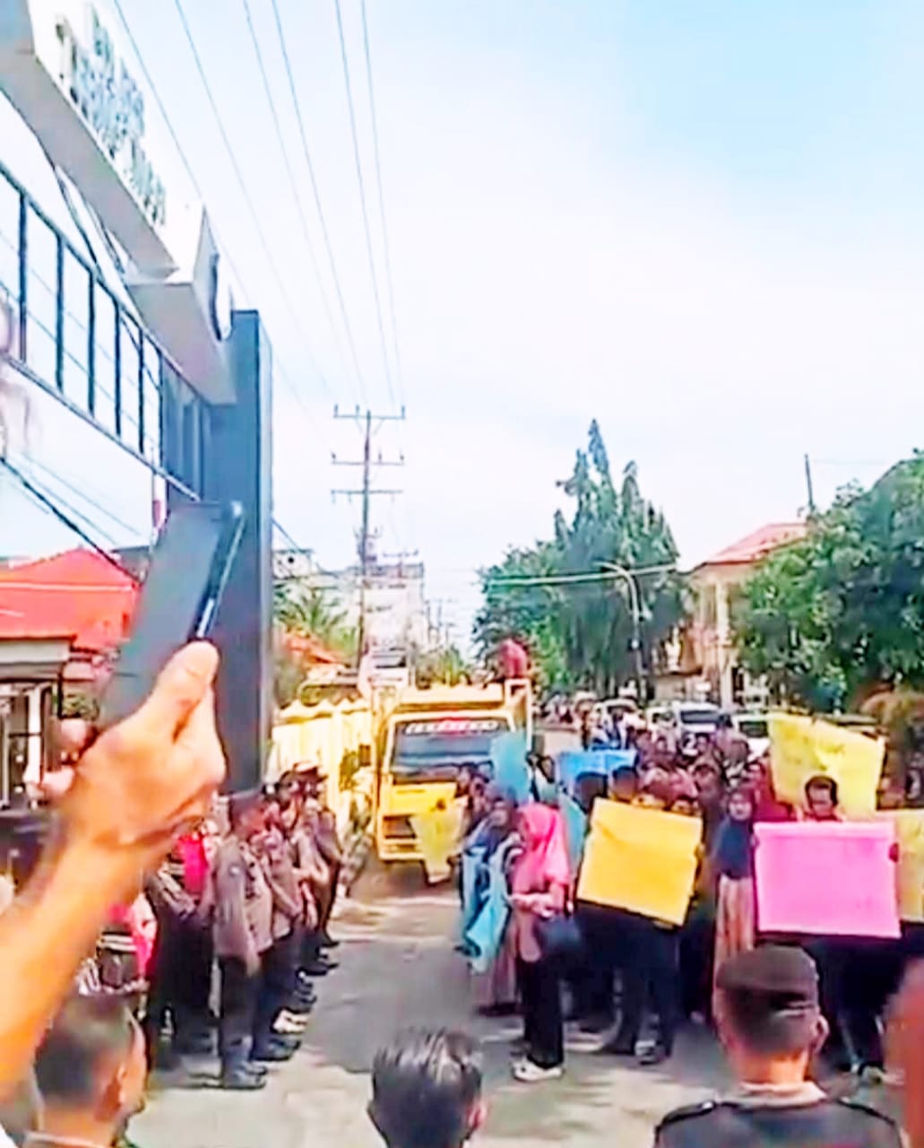Massa pengunjuk rasa mulai bergerak dari berbagai penjuru menutup jalan Pahlawan ber kumpul di depan Mapolres sembari berorasi secara bergantian