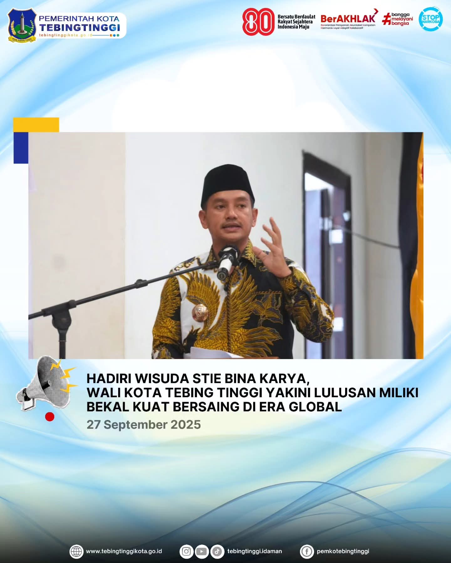 Yayasan Sekolah Tinggi Ilmu Ekonomi (STIE) Bina Karya yang berlokasi di Kampus III Jalan Diponegoro Simpang Rambung Kota Tebingtinggi menggelar Wisuda Program Magister terhadap 333 Mahasiswa Sarjana dan Ahli Madya Tahun Akademik 2024-2025, turut di hadiri Walikota Tebingtinggi H Iman Irdian Saragih,pada hari Sabtu (27/9/2025) bertempat di Aula lantai dua Gedung Pertemuan Balai kartini Baru Jalan Gunung Leuser Bp7 Kecamatan Rambutan Kota Tebingtinggi.