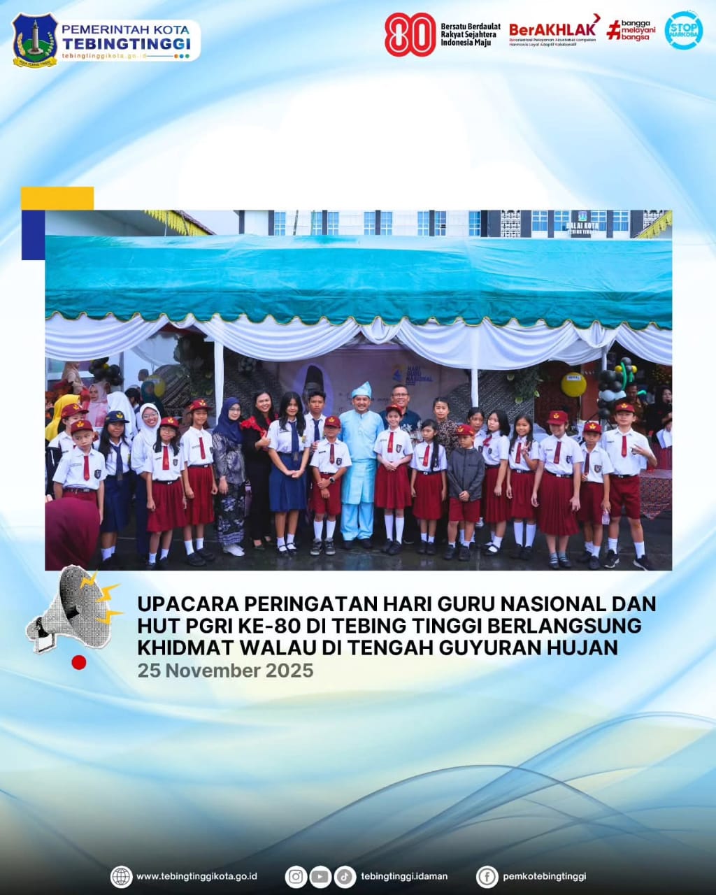Upacara peringatan Hari Guru Nasional (HGN) dan Hari Ulang Tahun (HUT) Persatuan Guru Republik Indonesia (PGRI) ke-80 tahun 2025 berlangsung khidmat walau di tengah guyuran hujan di Halaman Balai Kota Tebingtinggi, Selasa (25/11/2025).