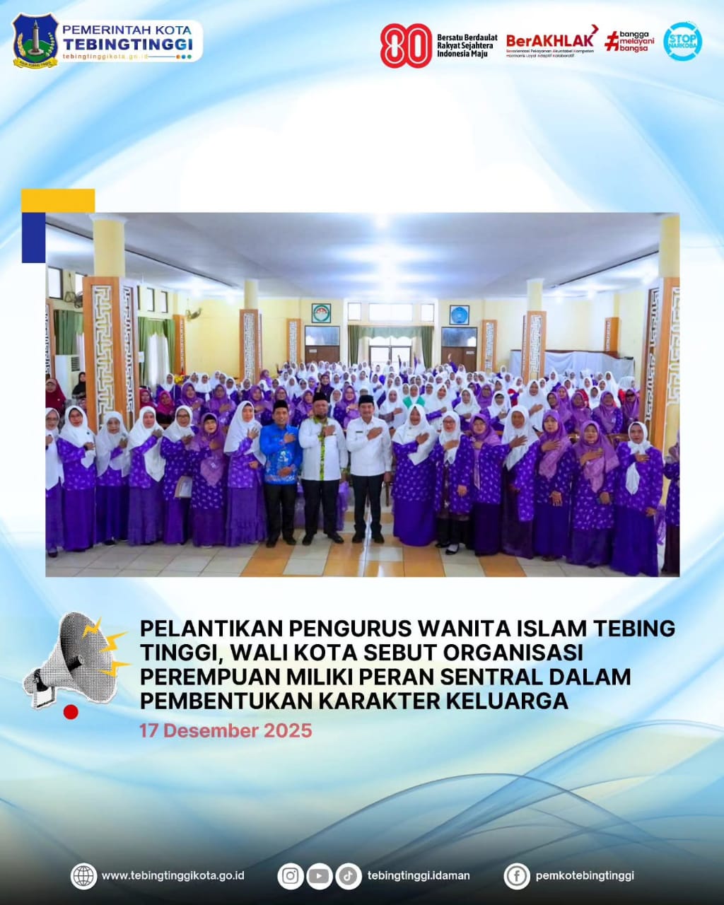 Wali Kota Tebingtinggi H. Iman Irdian Saragih menyebut organisasi perempuan seperti organisasi Wanita Islam bukan sekadar wadah berkumpul, melainkan motor penggerak masyarakat yang memiliki peran sentral dalam pembentukan karakter keluarga. Hal tersebut disampaikan Wali Kota Tebingtinggi H Iman Irdian Saragih dalam sambutannya saat menghadiri Pelantikan Pengurus Kecamatan dan Pengurus Ranting Wanita Islam se-Kota Tebingtinggi periode 2025-2030 di Gedung Hj. Sawiyah, Jalan Dr. Sutomo,pada hari Rabu (17/12/2025).