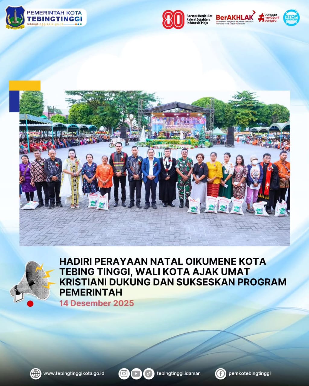 Hal ini disampaikan Wali Kota Iman Irdian Saragih dalam sambutannya di hadapan ribuan umat Kristiani yang antusias mengikuti Perayaan Natal Oikumene Kota Tebingtinggi Tahun 2025 di Lapangan Merdeka, Jalan Dr. Sutomo Kota Tebingtinggi,pada hari Minggu sore (14/12/2025).