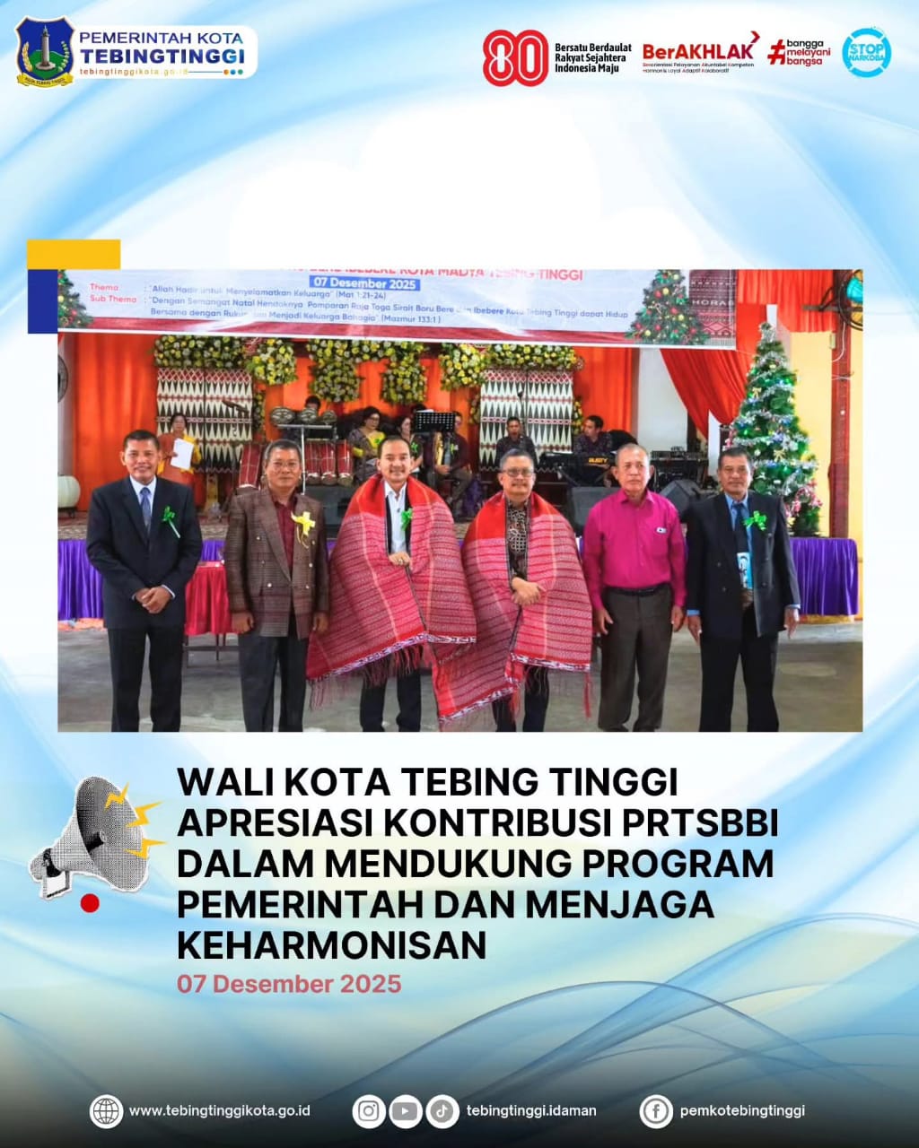 Wali Kota Tebingtinggi, H. Iman Irdian Saragih, menghadiri perayaan Natal Persekutuan Perempuan Huria Kristen Indonesia (HKI) Daerah XIV, yang meliputi wilayah Tebingtinggi, Serdang Bedagai, dan Batubara, yang digelar di Gedung Convention Center and Public Service Balai Pertemuan Kartini, Jln. Gunung Leuser BP7, Sabtu (06/12/2025).