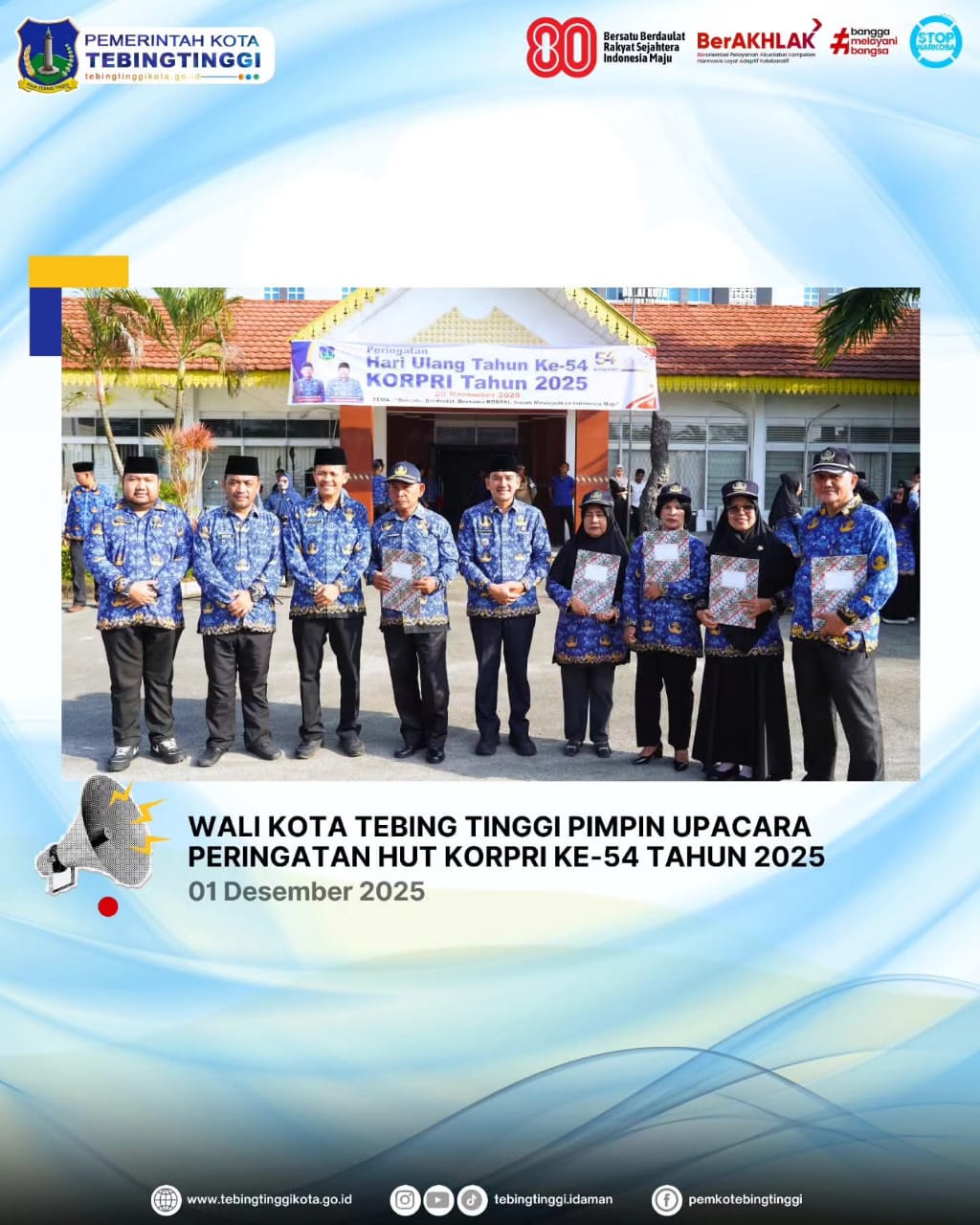Wali Kota Tebingtinggi, H. Iman Irdian Saragih, memimpin jalannya upacara peringatan Hari Ulang Tahun (HUT) KORPRI (Korps Pegawai Republik Indonesia) ke-54 Tahun 2025, Senin (1/12/2025) di halaman Gedung Balai Kota, Jalan Dr. Sutomo No. 14 Kota Tebingtinggi.