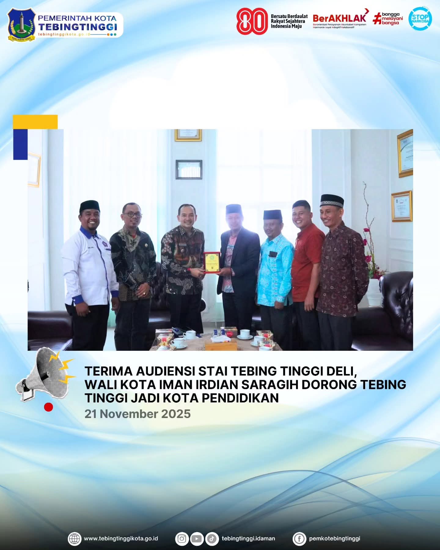 Wali Kota Tebingtinggi, H. Iman Irdian Saragih, menyatakan komitmen Pemerintah Kota (Pemko) untuk mendukung penuh pengembangan Sekolah Tinggi Agama Islam (STAI) Tebingtinggi Deli. Dukungan ini disampaikan Wali Kota saat menerima audiensi silaturahmi dari jajaran pimpinan STAI di Ruang Utama Kantor Wali Kota, Lantai 4 Balai Kota Tebingtinggi, Jumat (21/11/2025).