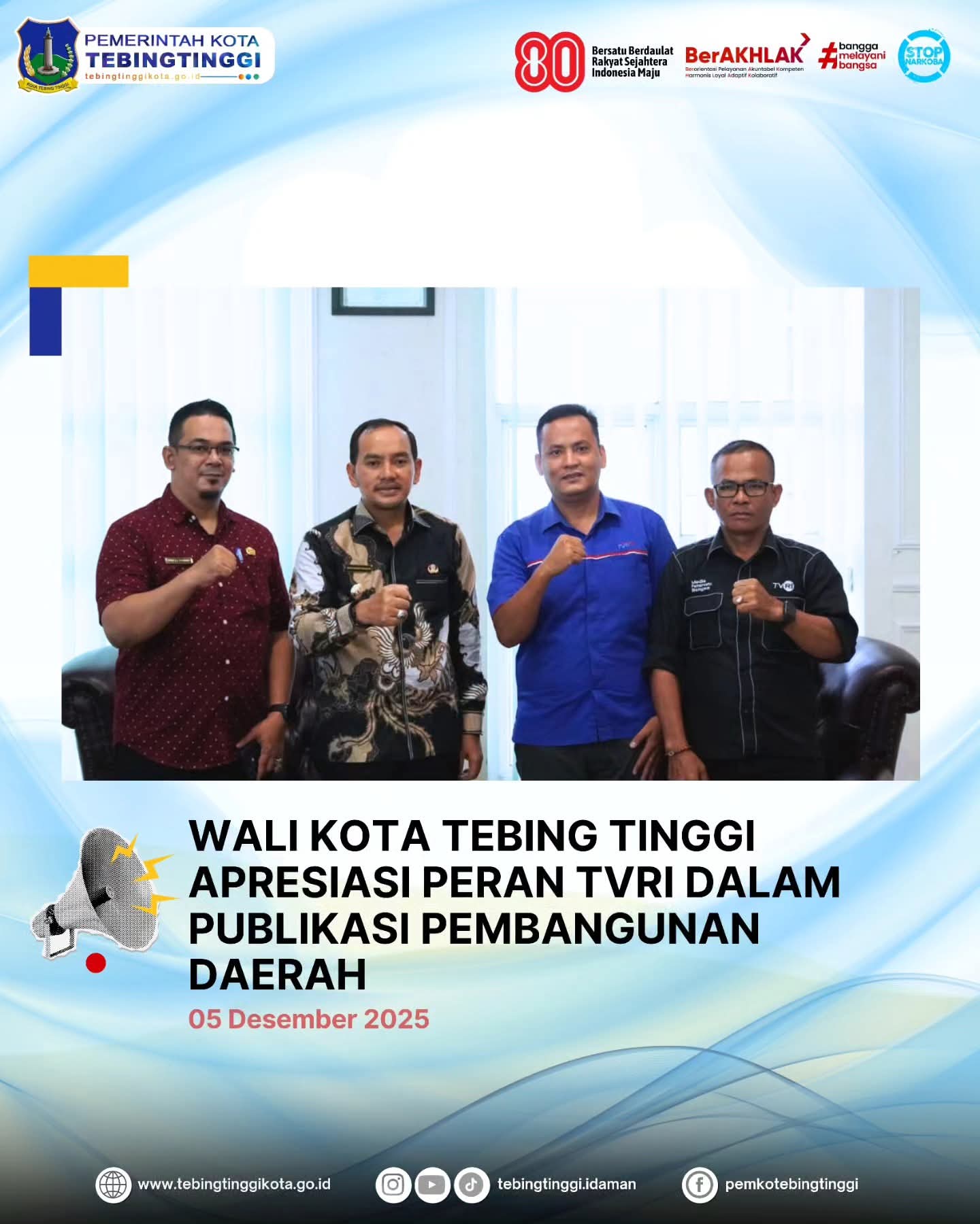 Apresiasi ini disampaikan Wali Kota Tebingtinggi saat menerima kunjungan audiensi dari jajaran TVRI Biro Tebingtinggi-Serdang Bedagai di ruang kerjanya, Lantai IV Gedung Balai Kota, Jln. Dr. Sutomo Kota Tebingtinggi No. 14,pada hari Jumat (05/12/2025).